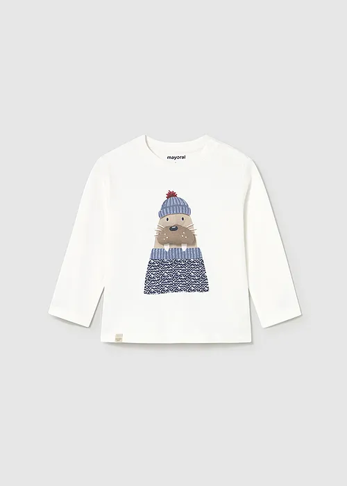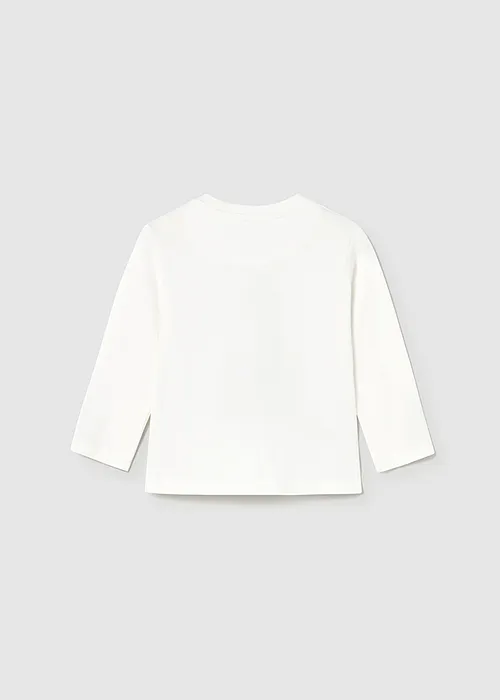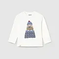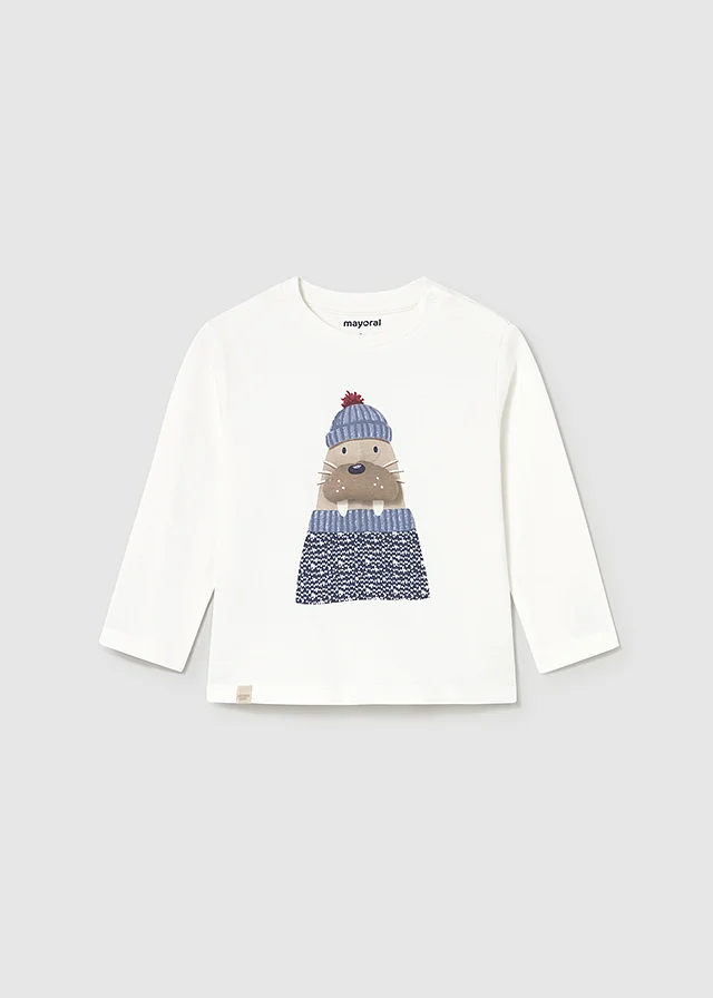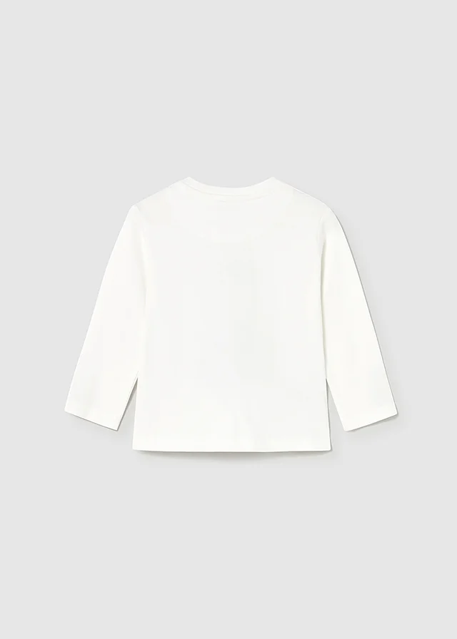 Camiseta de manga larga para bebé. Cuello redondo. Botones a presión en el hombro para facilitar la puesta de la prenda. Elementos de adorno: serigrafía (print). A partir de la talla 6-9, la abertura lateral se cambia por botones a presión en el hombro.