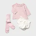 Original conjunto de tres piezas para recién nacida. Jersey de manga larga para recién nacida. Cuello redondo con detalles al tono. Cierre con botones en la espalda para facilitar la puesta de la prenda. Pantalón short tipo braguita que combina a la perfección en un look perfecto para tu bebé. Cinturilla elástica. Elementos de adorno: lazo. Leotardo de trama tupida para recién nacida con cintura elástica para un mejor ajuste. Al elegir nuestros productos de algodón estás apoyando nuestra inversión en la iniciativa Better Cotton. El algodón Better Cotton se obtiene mediante un sistema de balance de masas y no se puede rastrear físicamente hasta los productos finales. Sin embargo, los productores de algodón se benefician de la demanda de Better Cotton en volúmenes equivalentes.