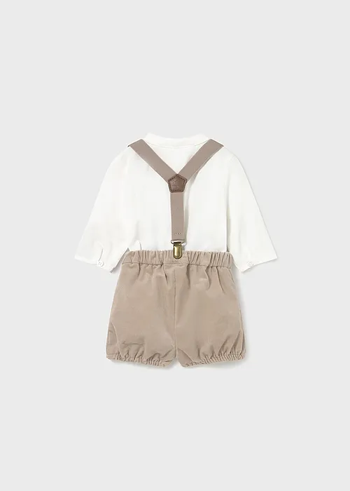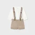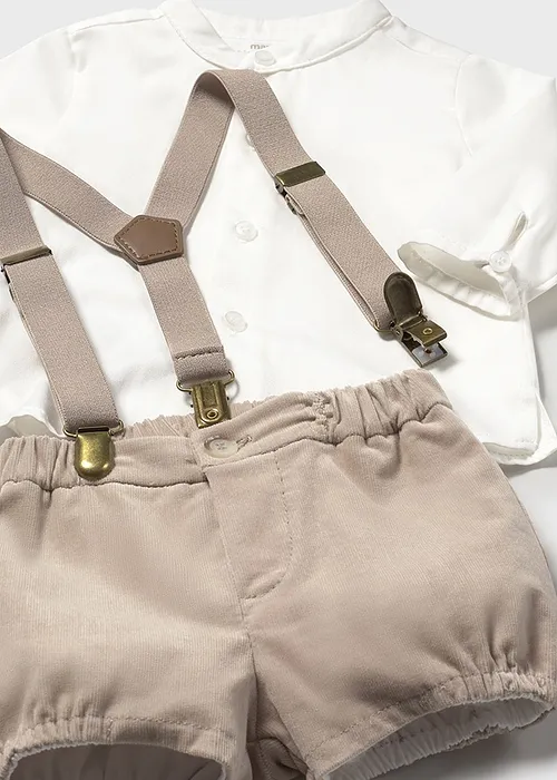 Conjunto de camisa y peto a juego para recién nacido. Camisa de manga larga para recién nacido. Modelo con cuello mao al tono. Cierre con botones en la parte delantera. Pantalón corto para recién nacido. Cierre con un único botón. Cinturilla elástica. Bajo elástico para un mejor ajuste. Tirantes elásticos ajustables para recién nacido que garantizan una perfecta sujeción.