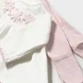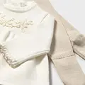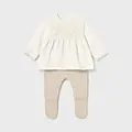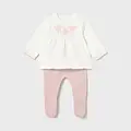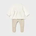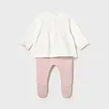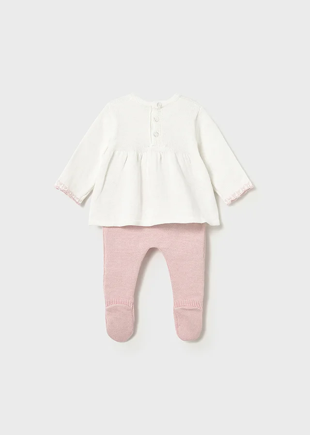 Conjunto tricot de dos piezas para recién nacida compuesto por jersey y polaina a juego. Jersey de manga larga para recién nacida. Cuello redondo. Cierre con botones en la espalda para facilitar la puesta de la prenda. Modelo con rizo. Elementos de adorno: bordados. Pantalón con pies tipo polaina. Cinturilla elástica. En este modelo las tallas mayores (de 6-9 a 18 meses) no llevan pies, para facilitar una mejor movilidad del bebé y mayor confort en el uso. Al elegir nuestros productos de algodón estás apoyando nuestra inversión en la iniciativa Better Cotton. El algodón Better Cotton se obtiene mediante un sistema de balance de masas y no se puede rastrear físicamente hasta los productos finales. Sin embargo, los productores de algodón se benefician de la demanda de Better Cotton en volúmenes equivalentes.