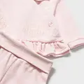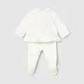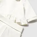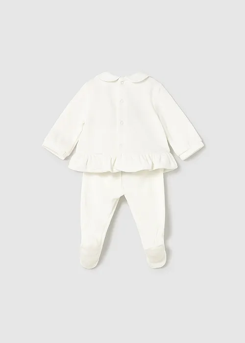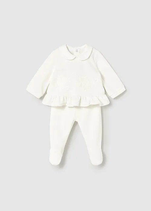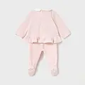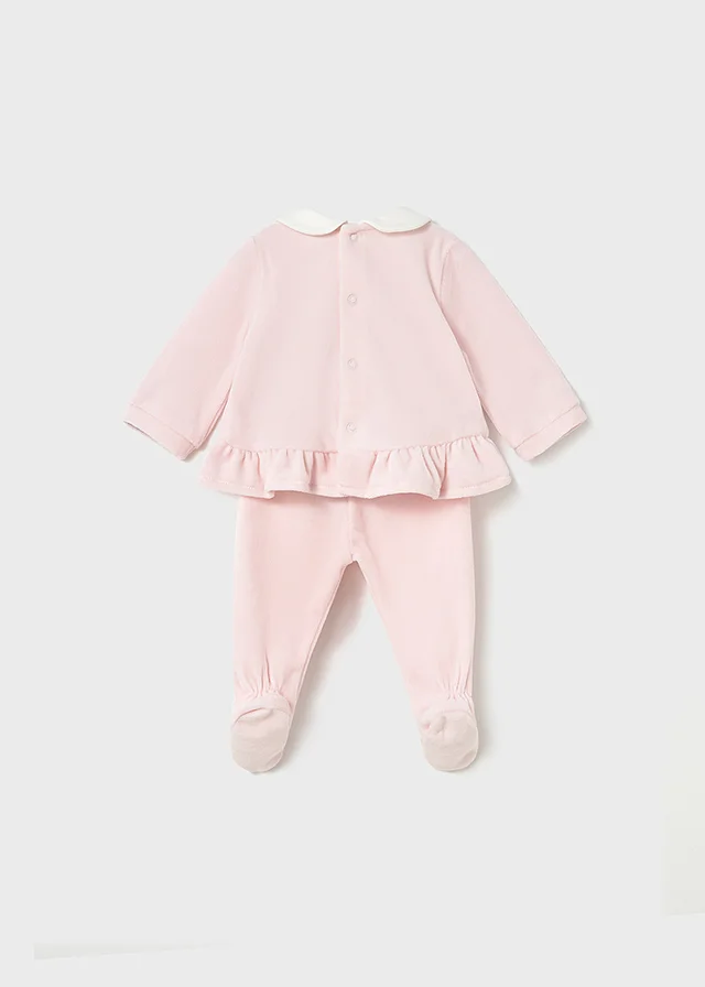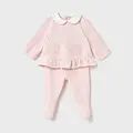 Conjunto de dos piezas para recién nacida compuesto por una camiseta de manga larga y polaina a juego. Camiseta de manga larga para recién nacida. Cuello bebé. Cierre con botones a presión en la parte posterior. Diseño con volante en el bajo de la prenda. Elementos de adorno: aplique floral, bordados. Pantalón con pies tipo polaina. Cinturilla elástica. En este modelo las tallas mayores (de 6-9 a 18 meses) no llevan pies, para facilitar una mejor movilidad del bebé y mayor confort en el uso. Al elegir nuestros productos de algodón estás apoyando nuestra inversión en la iniciativa Better Cotton. El algodón Better Cotton se obtiene mediante un sistema de balance de masas y no se puede rastrear físicamente hasta los productos finales. Sin embargo, los productores de algodón se benefician de la demanda de Better Cotton en volúmenes equivalentes.