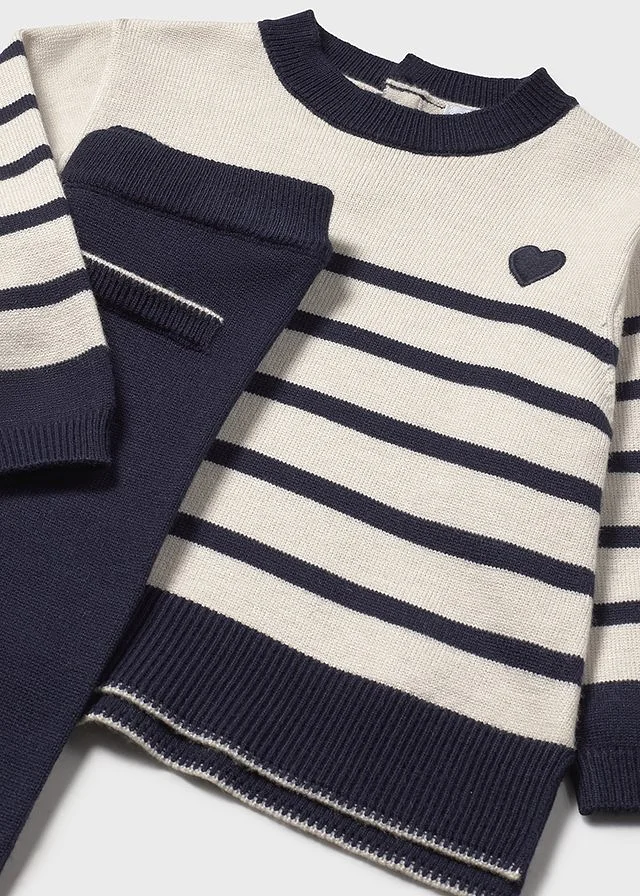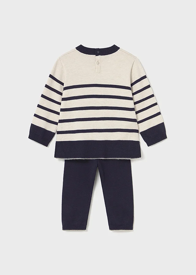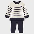 Contiene poliéster reciclado. Conjunto de jersey con pantalón largo a juego para bebé. Jersey de manga larga para bebé. Cuello redondo. Cierre con botones en la espalda para facilitar la puesta de la prenda. Cómodo tejido de punto. Elementos de adorno: bordados, detalles de canalé. Pantalón para bebé. Cinturilla elástica. Elementos de adorno: detalles de canalé.