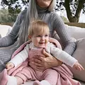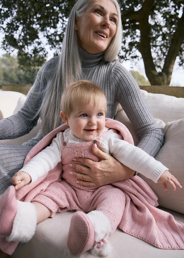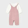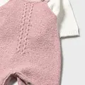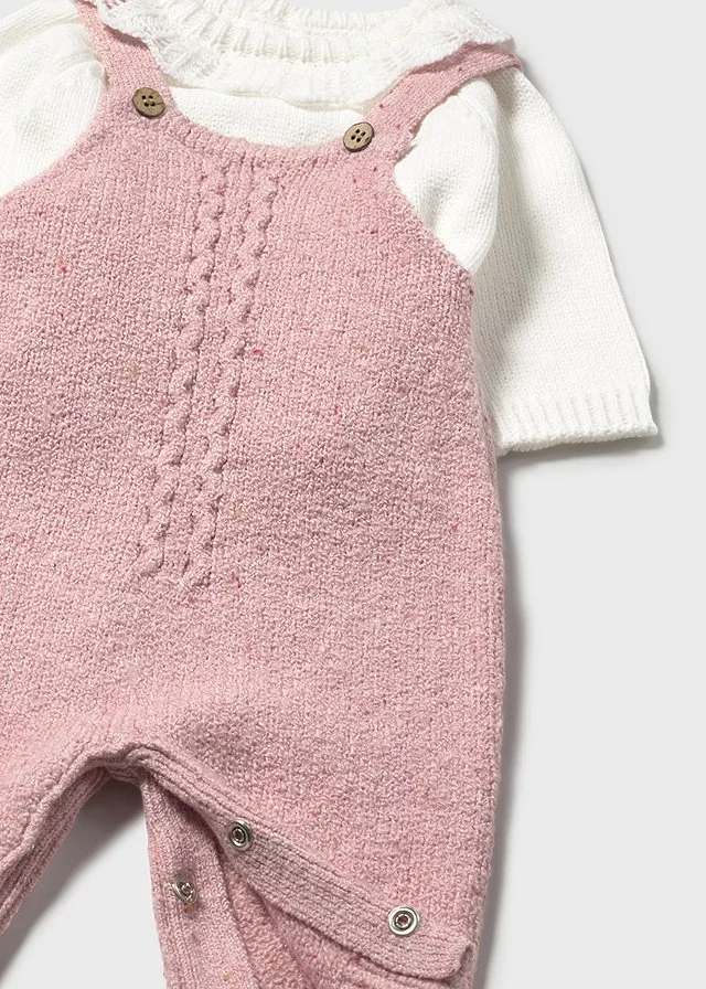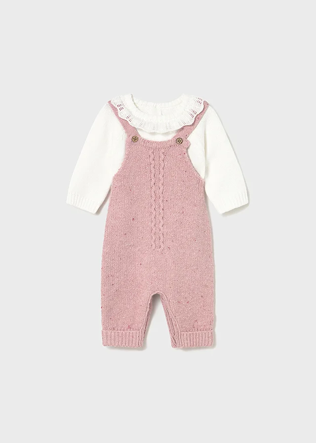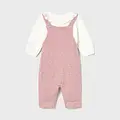 Original conjunto para recién nacida. Tejido de punto tricotosa de tacto suave y agradable. Jersey de manga larga para recién nacida. Cuello con ondas. Cierre con botones a presión en la parte posterior. Diseño con tirantes. Las tallas grandes (desde 6-9 a 18 meses) no llevarán dicha abertura. Cierre con botones.
