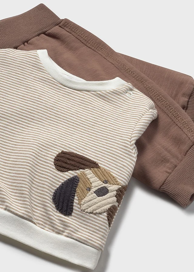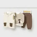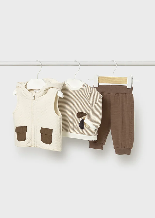 Original conjunto de tres piezas para recién nacido. Chaleco sin mangas para recién nacido. Cuello con capucha. Cierre central delantero con cremallera. Bolsillos funcionales en la parte delantera. Sudadera de manga larga para recién nacido. Cuello redondo. Botones a presión en el hombro para facilitar la puesta de la prenda. Elementos de adorno: aplique decorativo, serigrafía (print). Pantalón largo deportivo para recién nacido de gran confort. Al elegir nuestros productos de algodón estás apoyando nuestra inversión en la iniciativa Better Cotton. El algodón Better Cotton se obtiene mediante un sistema de balance de masas y no se puede rastrear físicamente hasta los productos finales. Sin embargo, los productores de algodón se benefician de la demanda de Better Cotton en volúmenes equivalentes.