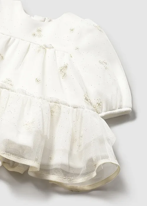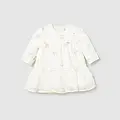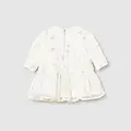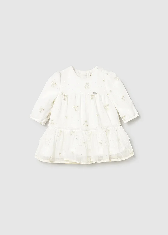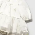 Vestido de manga larga para recién nacida. Cuello redondo. Cierre central trasero con cremallera oculta. Mezcla de tejidos combinados para lograr un diseño único y diferente. Modelo con forro interior. Modelo con rizo y volantes.