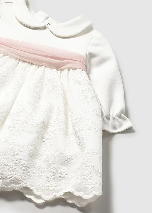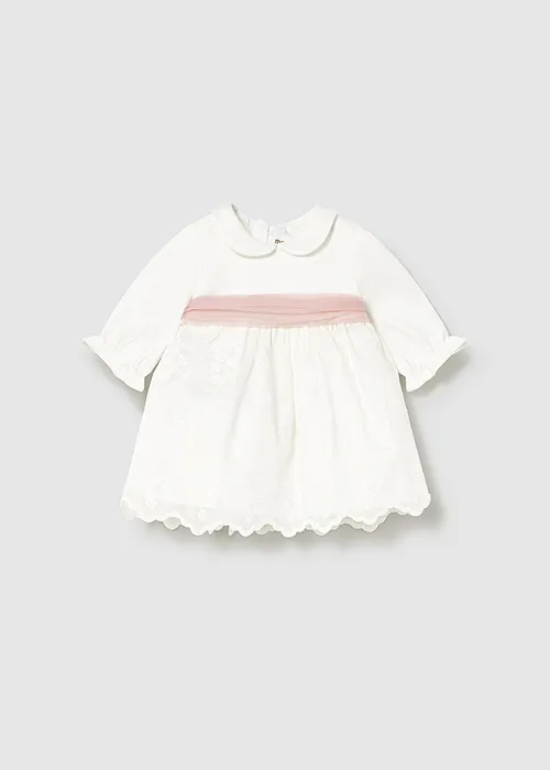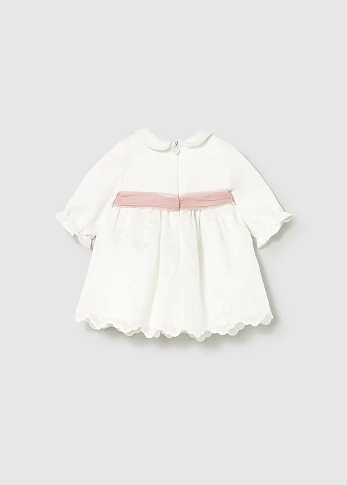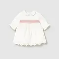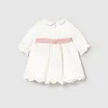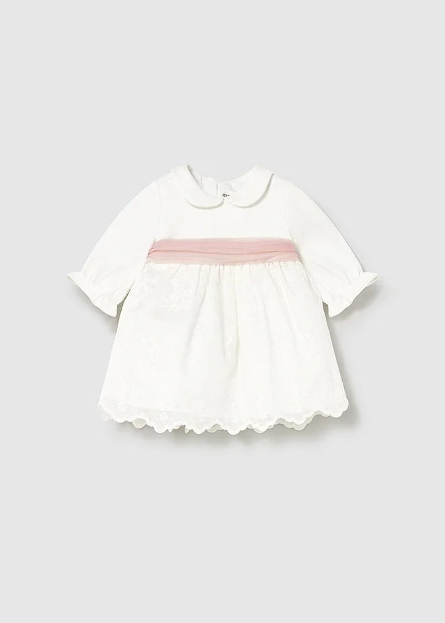 Vestido de manga larga para recién nacido. Cuello bebé. Cierre con cremallera trasera invisible. Modelo con forro interior. Modelo con rizo. Elementos de adorno: bordados, fajín simulado a la cintura.