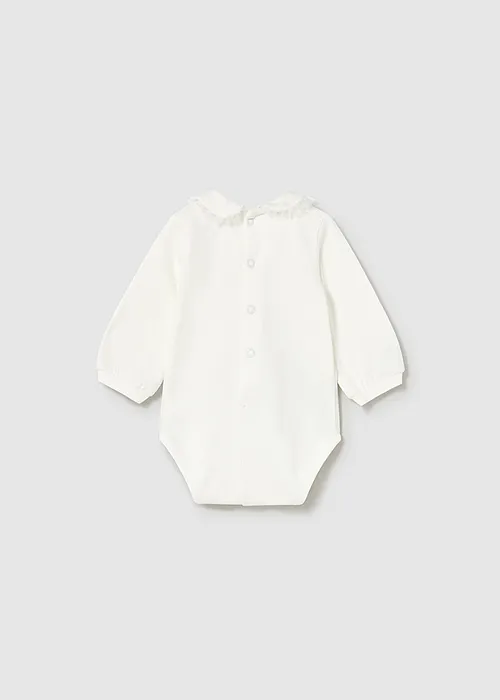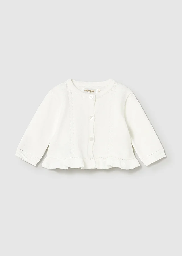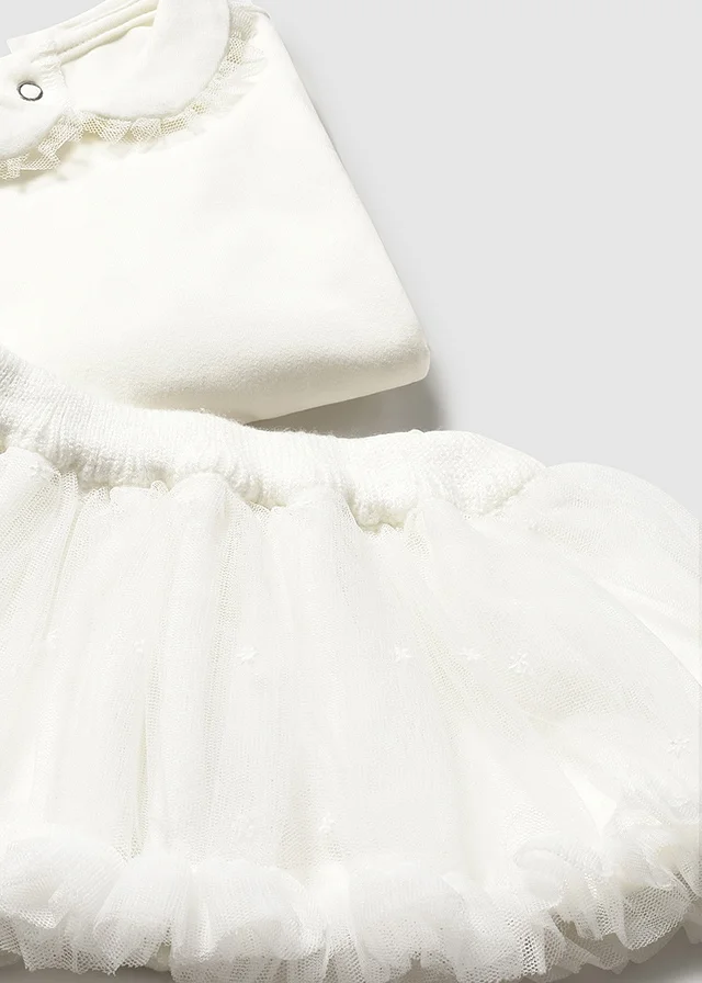 Original conjunto de tres piezas para recién nacida. Rebeca de manga larga para recién nacida. Cuello redondo. Cierre con botones en la parte delantera. Diseño con volante en el bajo de la prenda. Body de manga larga para recién nacida con puños elásticos. Cuello bebé. Cierre con botones a presión en la parte posterior. Botones a presión en la entrepierna para facilitar la puesta de la prenda. Elementos de adorno: volante decorativo. Falda para recién nacida. Cinturilla elástica. Al elegir nuestros productos de algodón estás apoyando nuestra inversión en la iniciativa Better Cotton. El algodón Better Cotton se obtiene mediante un sistema de balance de masas y no se puede rastrear físicamente hasta los productos finales. Sin embargo, los productores de algodón se benefician de la demanda de Better Cotton en volúmenes equivalentes.