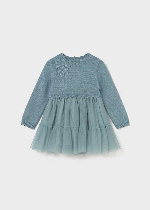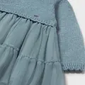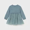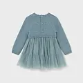 Contiene poliéster reciclado. Vestido de manga larga para bebé. Cuello con ondas. Diseño simulado con jersey en superposición. Cierre con botones en la espalda para facilitar la puesta de la prenda. Confección en tejido de tul ligero y vaporoso. Suave forro interior de poliéster. Elementos de adorno: apliques decorativos.