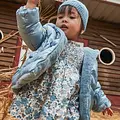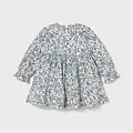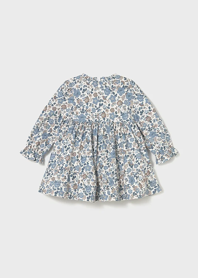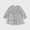 Vestido de manga larga para bebé. Cierre central trasero con cremallera oculta. Modelo con forro interior. Este modelo lleva detalles de nido de abeja. Modelo con rizo y volantes. Diseño estampado.