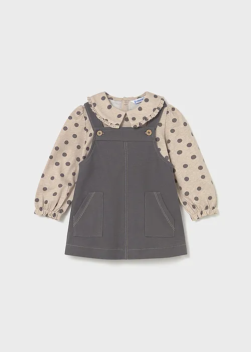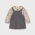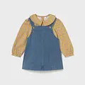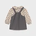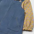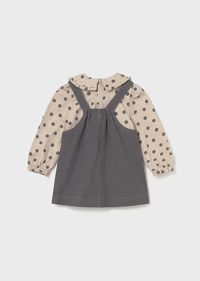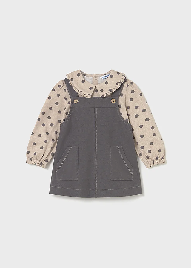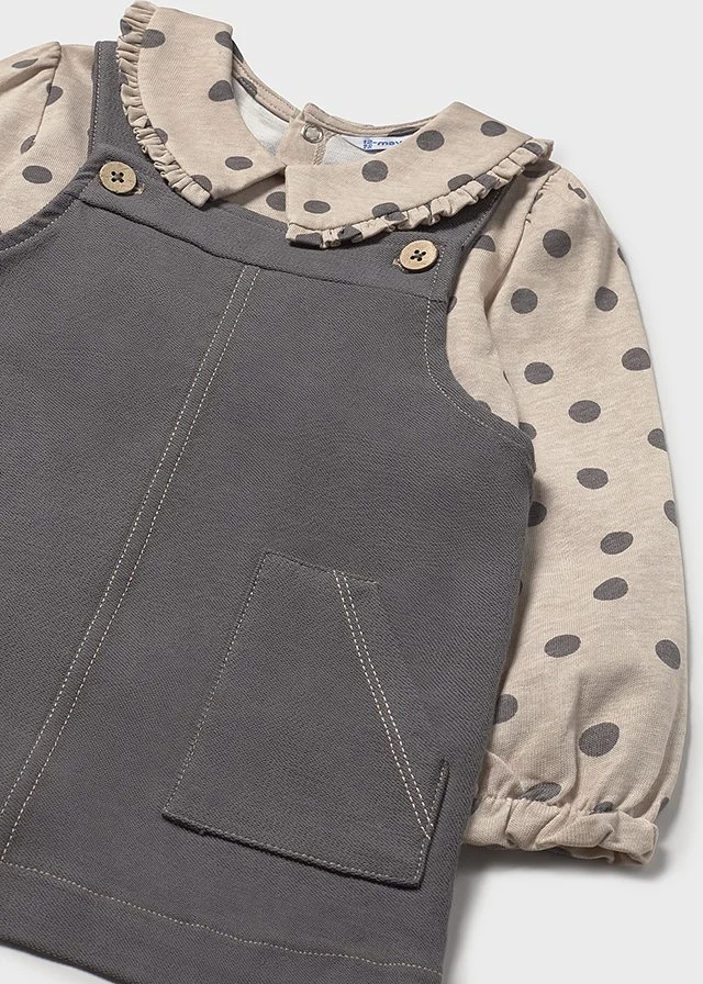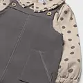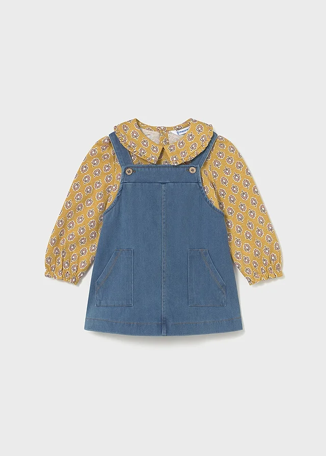 Original conjunto para bebé. Camiseta de manga larga para bebé con puños elásticos. Cuello bebé con detalle de volantes. Diseño estampado. Original falda peto para bebé. Cierre con botones. Bolsillos funcionales en la parte delantera.