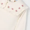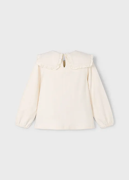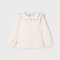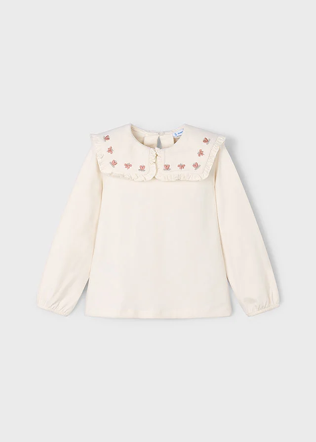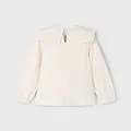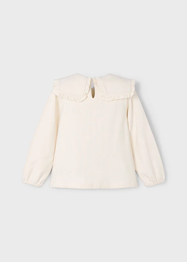 Blusa de manga larga para niña con puños elásticos. Cuello redondo con volante. Cierre con botones en la parte delantera. Diseño estampado.