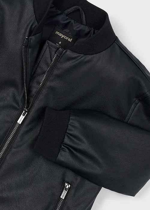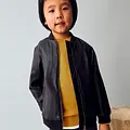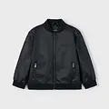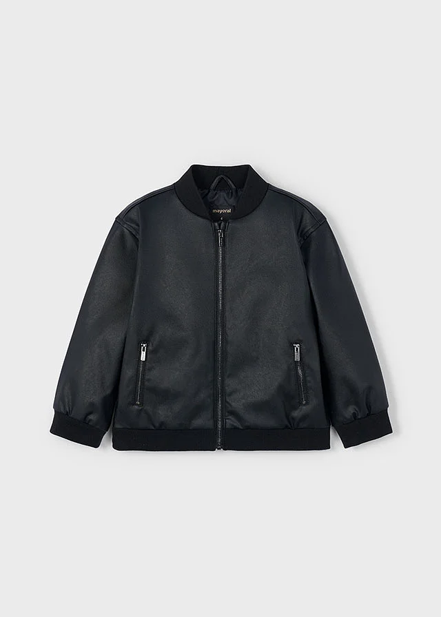 Cazadora de manga larga unisex para niño y niña. Cuello bomber. Cierre central delantero con cremallera. Moderno exterior de polipiel. Suave forro interior de poliéster. Bolsillos funcionales en la parte delantera. Se trata de un artículo de diseño unisex de gran versatilidad por la neutralidad de sus tonos y su forma.