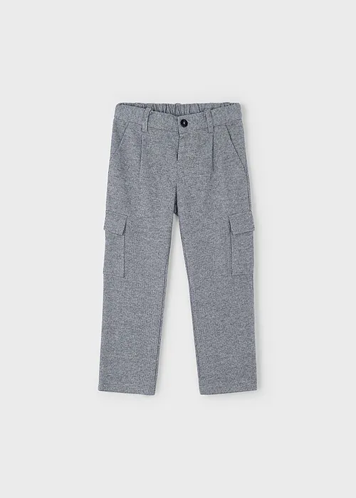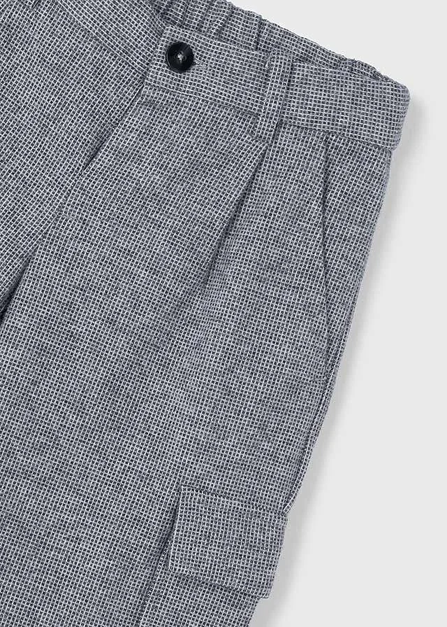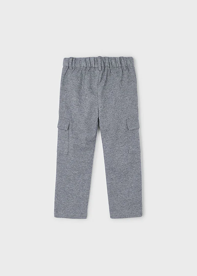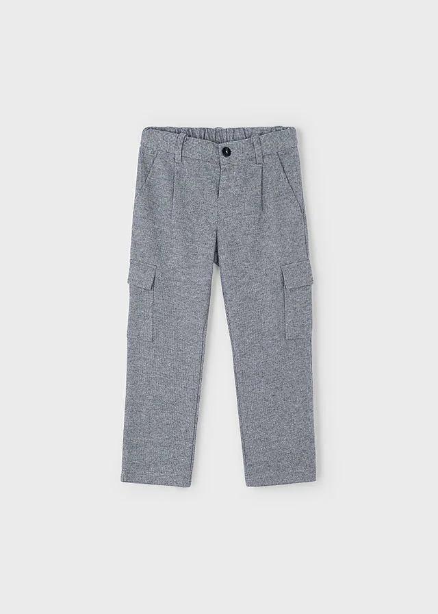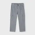 Pantalón largo para niño de estilo cargo, holgado en la parte superior, tiro caído y ajuste normal en la pernera. Cierre con cremallera y botón. Goma elástica regulable con botones en el interior de la cinturilla para mayor ajuste. Diseño con múltiples bolsillos. Por motivos de seguridad, las tallas pequeñas (2-5 años) no llevarán cremallera en la bragueta, sino que será simulada.