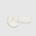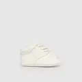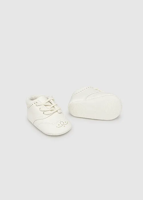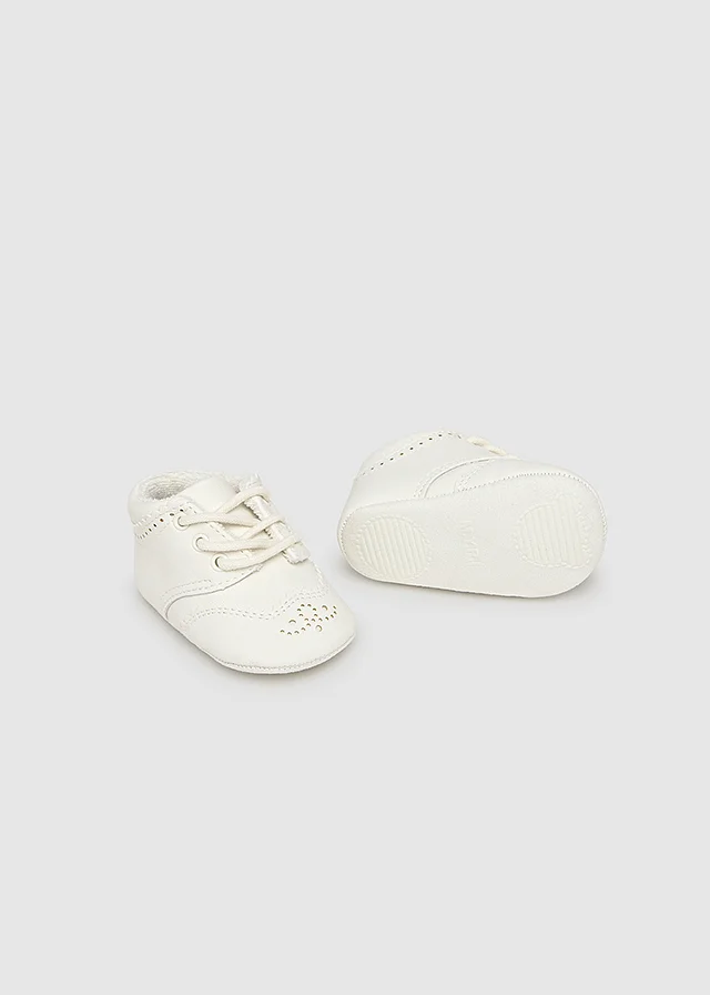 Zapatos de vestir para recién nacido ideales para los momentos más elegantes, sin renunciar a la comodidad. Material exterior efecto piel. Forro interior y plantilla de algodón transpirable. Suela de goma antideslizante para afianzar la pisada. Cierre con cordones que permiten un mejor ajuste y mayor sujeción del pie. Motivos calados decorativos. Este artículo se presenta en una caja de la línea Newborn ideal para regalar en ocasiones especiales.