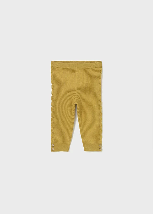 Pantalón tipo legging para bebé. Cinturilla elástica. Tejido de punto tricotosa de tacto suave y agradable. Elementos de adorno: botones decorativos, detalles trenzados, detalles de canalé.