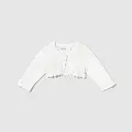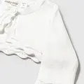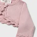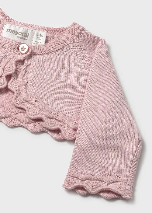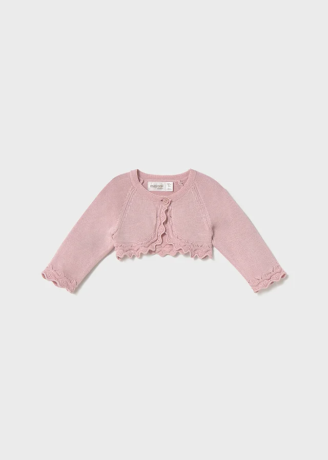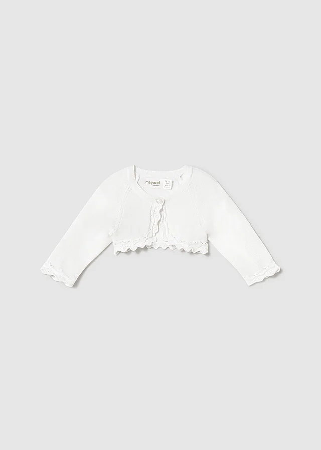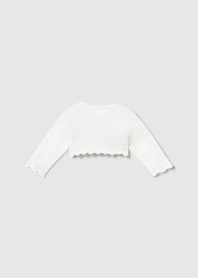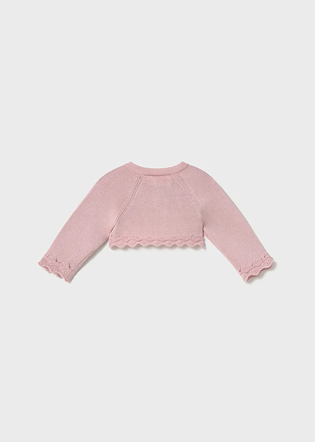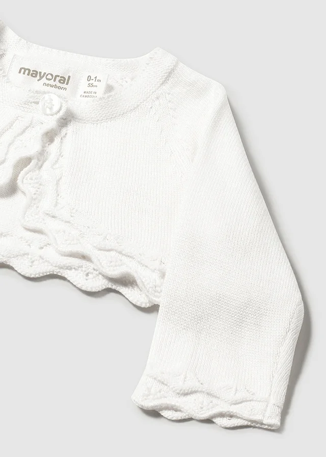 Rebeca de manga ranglán para recién nacida. Cierre con un único botón. Tejido de punto tricotosa de tacto suave y agradable. Elementos de adorno: motivos calados, detalles de ondas. Al elegir nuestros productos de algodón estás apoyando nuestra inversión en la iniciativa Better Cotton. El algodón Better Cotton se obtiene mediante un sistema de balance de masas y no se puede rastrear físicamente hasta los productos finales. Sin embargo, los productores de algodón se benefician de la demanda de Better Cotton en volúmenes equivalentes. Modelo perteneciente a nuestra colección Mayoral Basic, una prenda esencial en su armario para completar cualquier look.