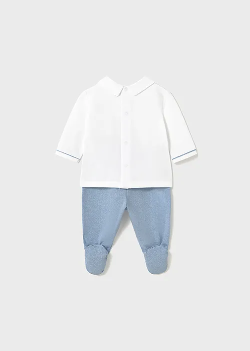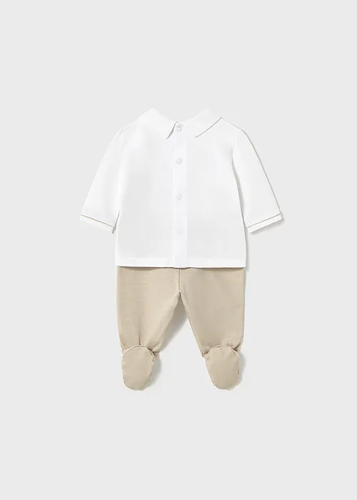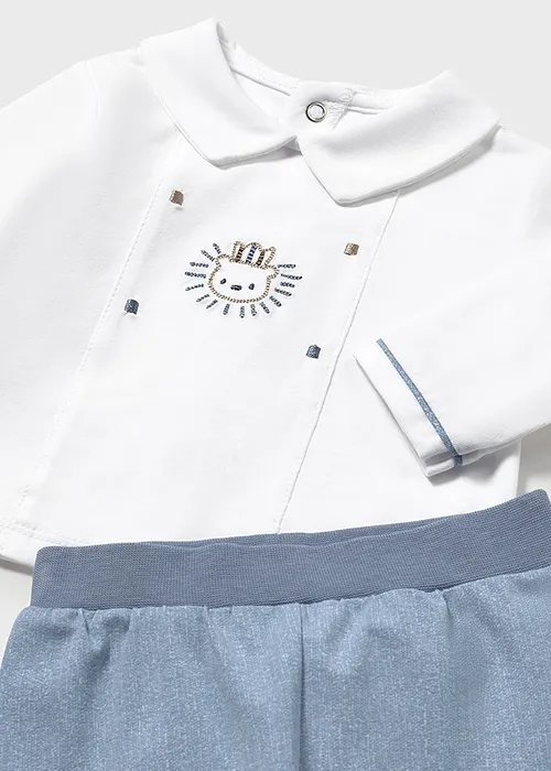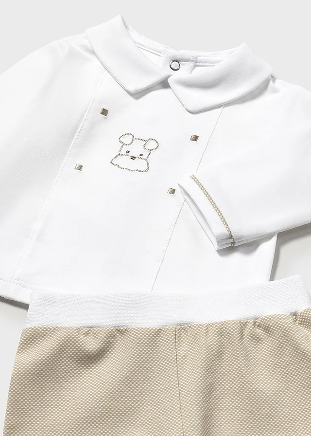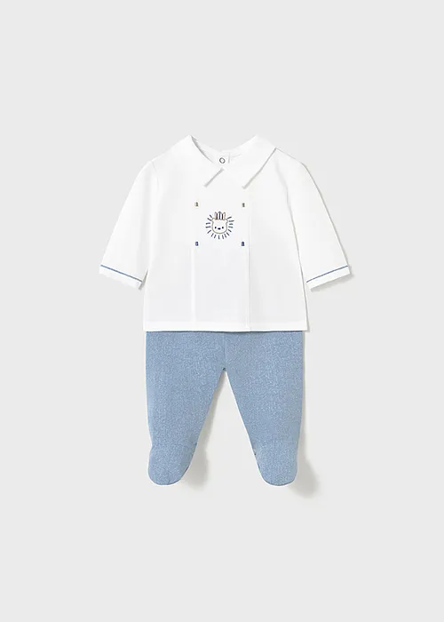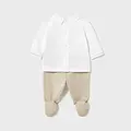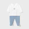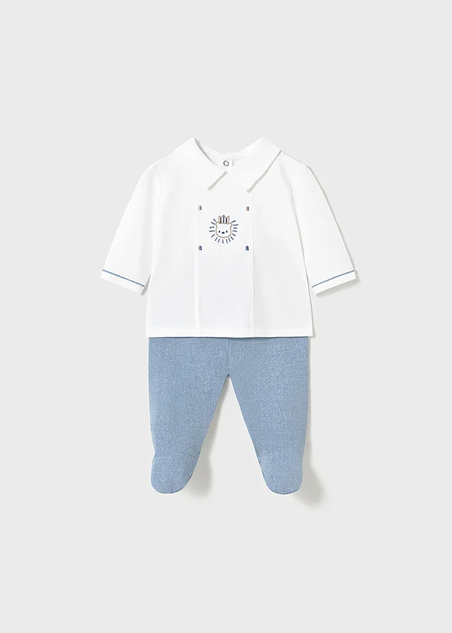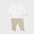 Conjuntounto de dos piezas para recién nacido compuesto por una Franela de manga larga y polaina a juego. Franela de manga larga para recién nacido. Cuello camisero. Cierre con botones en la espalda para facilitar la puesta de la prenda. Elementos de adorno: bordado. Diseño con pies. Pantalón con pies tipo polaina. Cinturilla elástica. En este modelo las tallas mayores (de 6-9 a 18 meses) no llevan pies, para facilitar una mejor movilidad del bebé y mayor confort en el uso. Al elegir nuestros productos de algodón estás apoyando nuestra inversión en la iniciativa Better Cotton. El algodón Better Cotton se obtiene mediante un sistema de balance de masas y no se puede rastrear físicamente hasta los productos finales. Sin embargo, los productores de algodón se benefician de la demanda de Better Cotton en volúmenes equivalentes.
