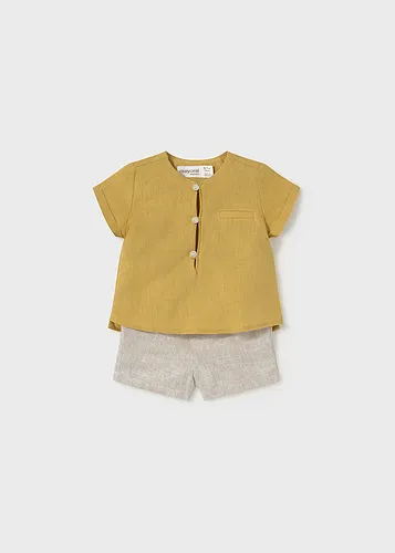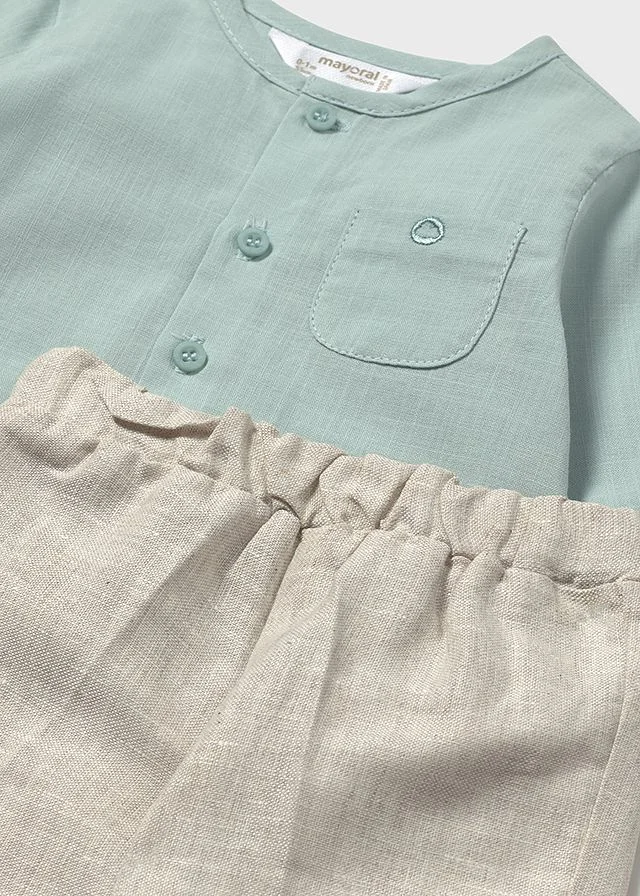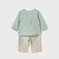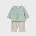 Elegante Conjunto de camisa y pantalón largo combinados para recién nacido. Camisa de manga larga para recién nacido. Cuello redondo. Cierre con botones en la parte delantera. Tejido de aspecto fresco y actual con lino. Modelo con aberturas laterales en el bajo que dan mayor holgura. Elementos de adorno: bordado. Diseño liso. Cinturilla elástica. Tejido de aspecto fresco y actual con lino. Al elegir nuestros productos de algodón estás apoyando nuestra inversión en la iniciativa Better Cotton. El algodón Better Cotton se obtiene mediante un sistema de balance de masas y no se puede rastrear físicamente hasta los productos finales. Sin embargo, los productores de algodón se benefician de la demanda de Better Cotton en volúmenes equivalentes.