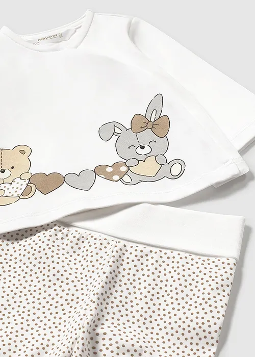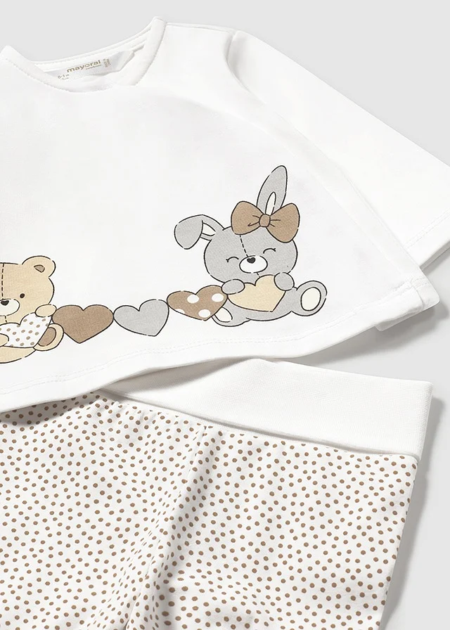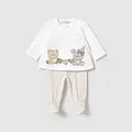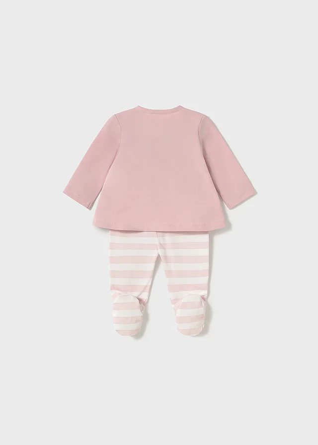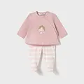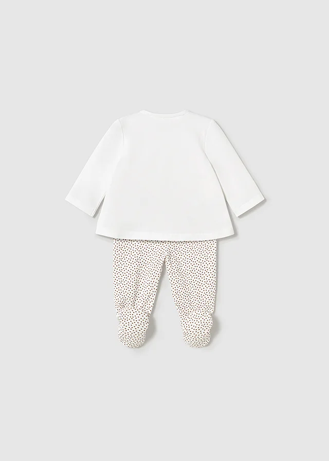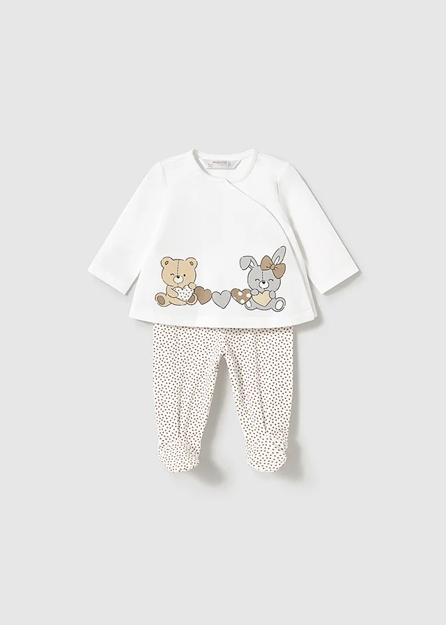 Conjuntounto de dos piezas para recién nacido compuesto por una Franela de manga larga y polaina a juego. Franela de manga larga para recién nacido. Cierre lateral con botones a presión. Diseño estampado. Pantalón con pies tipo polaina. Cinturilla elástica. Diseño estampado. En este modelo las tallas mayores (de 6-9 a 18 meses) no llevan pies, para facilitar una mejor movilidad del bebé y mayor confort en el uso. Al elegir nuestros productos de algodón estás apoyando nuestra inversión en la iniciativa Better Cotton. El algodón Better Cotton se obtiene mediante un sistema de balance de masas y no se puede rastrear físicamente hasta los productos finales. Sin embargo, los productores de algodón se benefician de la demanda de Better Cotton en volúmenes equivalentes.
