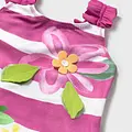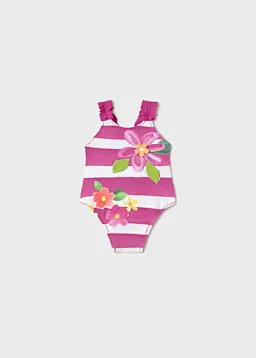 Bañador de tirantes con volantes para bebé. Tejido elástico que aporta confort y libertad de movimientos. Motivo de flores. Motivo de rayas.