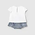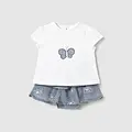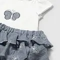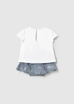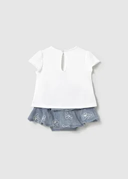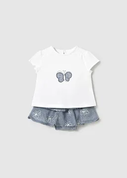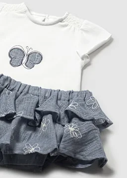 Conjuntounto de Franela y falda a juego para recién nacido. Franela de manga corta para recién nacido. Cuello redondo. Cierre con un único botón. Modelo con rizo. Elementos de adorno: bordado, detalles fruncidos de punto smock (nido de abeja), aplique posicionado. Falda para recién nacido. Botones a presión en la entrepierna para facilitar la puesta de la prenda. Cinturilla elástica. Modelo con diseño de volantes.