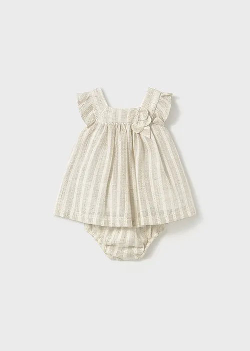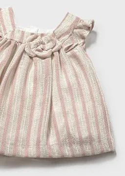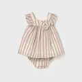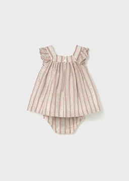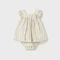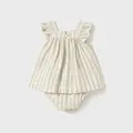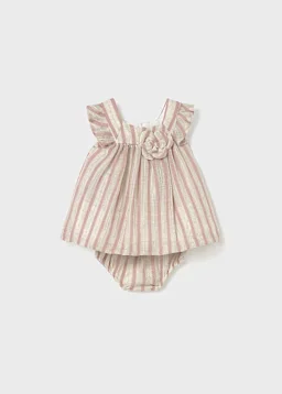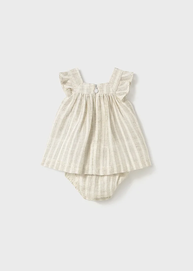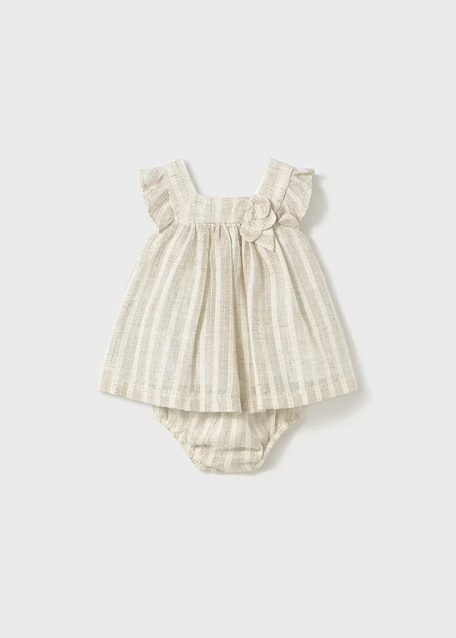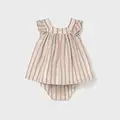 Conjuntounto de dos piezas para recién nacida formado por un vestido con cubrepañal a juego. Vestido de tirantes con volantes para recién nacida. Cierre con cremallera trasera invisible. Tejido de aspecto fresco y actual con lino. Modelo con forro interior. Modelo con rizo. Elementos de adorno: aplique floral. Motivo de rayas. Este exclusivo artículo pertenece a la colección de Ceremonia y ha sido diseñado para celebraciones, eventos y ocasiones especiales. Cubrepañal para recién nacida. Cinturilla elástica.