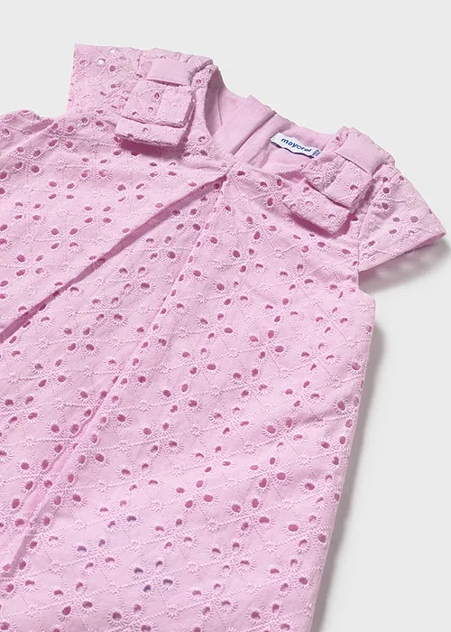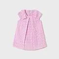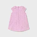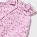 Vestido de manga corta para bebé. Cierre con cremallera trasera invisible. Tejido perforado original y fresco. Modelo con fuelle. Elementos de adorno: apliques de lazos.