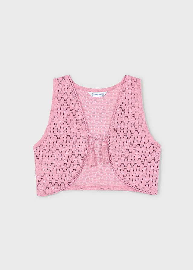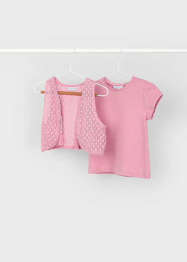 Original set de dos piezas para niña. Franela de manga corta para niña. Cuello redondo. Elementos de adorno: detalles fruncidos. Chaleco para niña. Elementos de adorno: encajes, flecos.