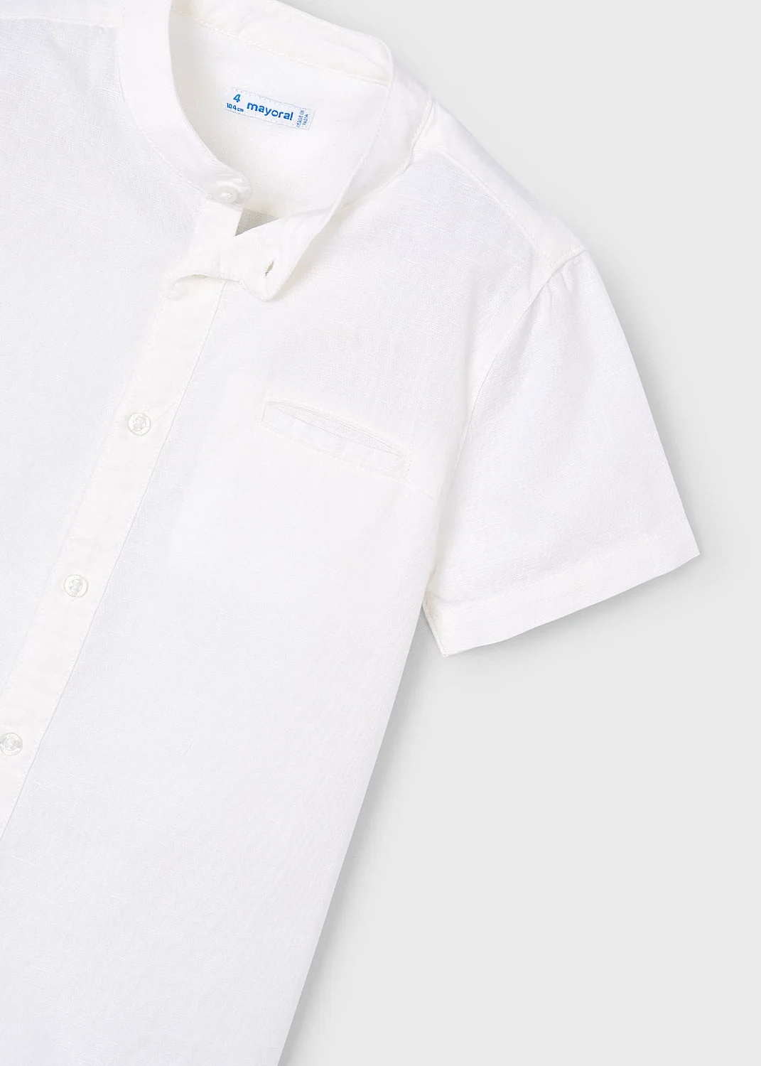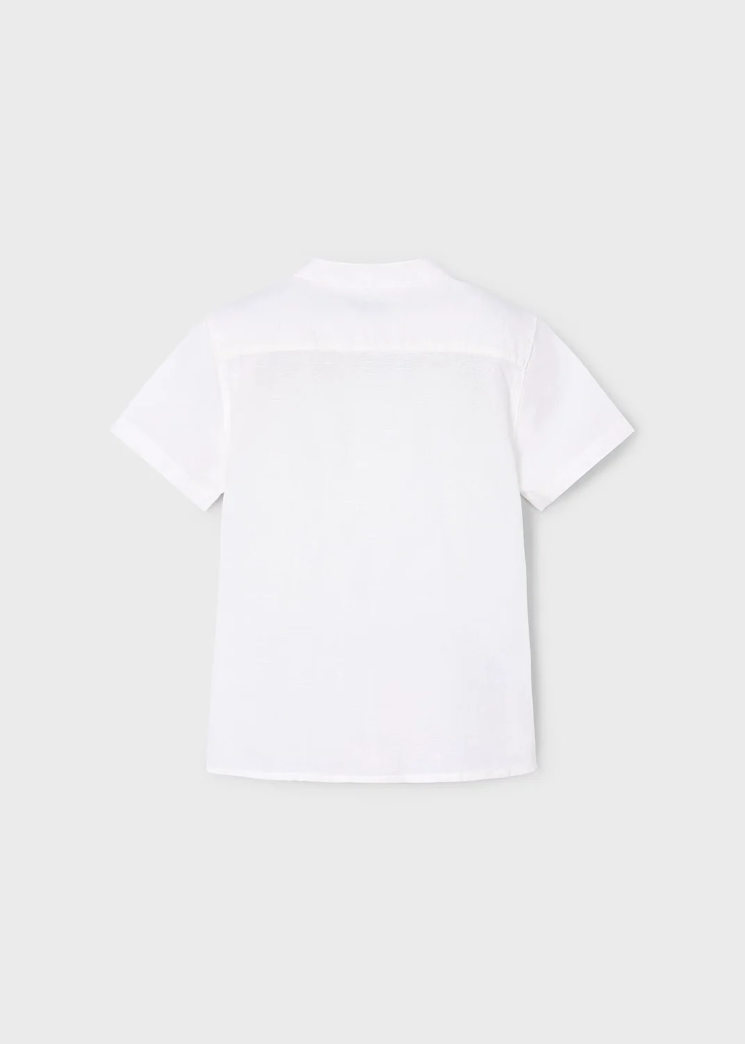 Camisa de manga corta para niño. Modelo con cuello mao al tono. Cierre con botones en la parte delantera. Tejido de aspecto fresco y actual con lino. Al elegir nuestros productos de algodón estás apoyando nuestra inversión en la iniciativa Better Cotton. El algodón Better Cotton se obtiene mediante un sistema de balance de masas y no se puede rastrear físicamente hasta los productos finales. Sin embargo, los productores de algodón se benefician de la demanda de Better Cotton en volúmenes equivalentes.