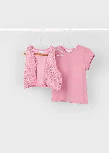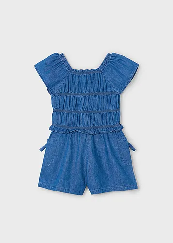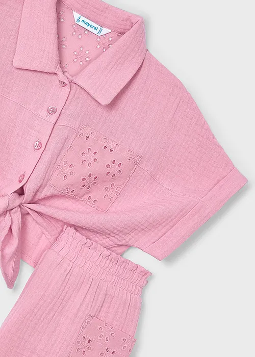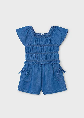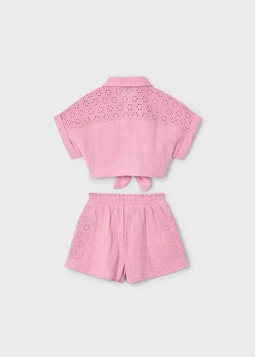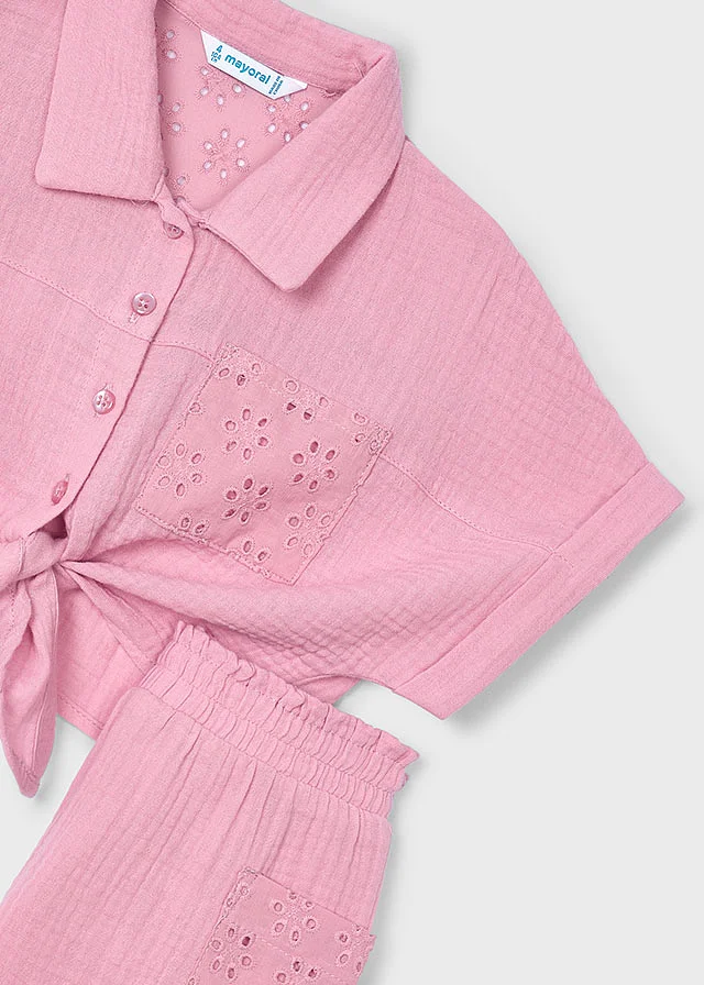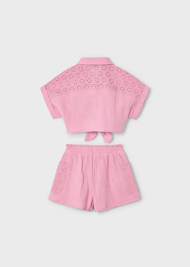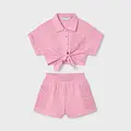 Conjuntounto de dos piezas para niña compuesto por un blusón con short a juego. Blusa de manga corta para niña. Cuello camisero. Cierre con botones en la parte delantera. Tejido perforado original y fresco. Bolsillo funcional en la parte delantera. Pantalón corto para niña. Cinturilla elástica. Bolsillos en los laterales.