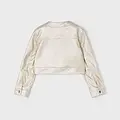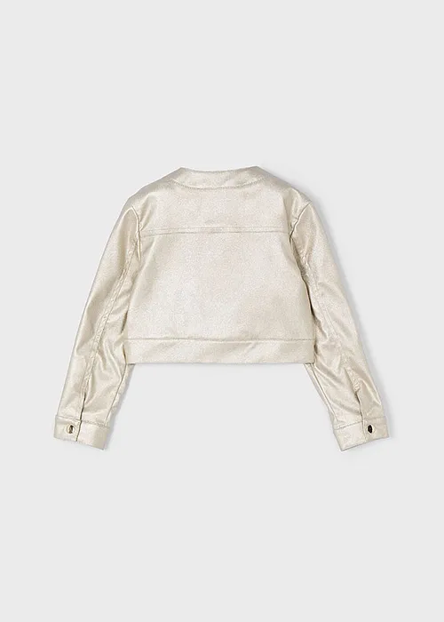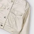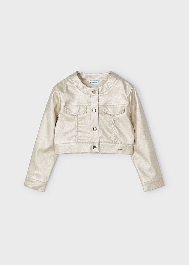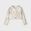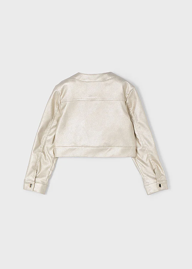 Chaqueta de manga larga para niña con puños abotonados. Cuello redondo. Cierre con botones a presión en la parte delantera. Moderno exterior de polipiel. Suave forro interior de poliéster. Bolsillos delanteros decorativos simulados. Acabado metalizado.