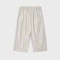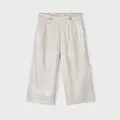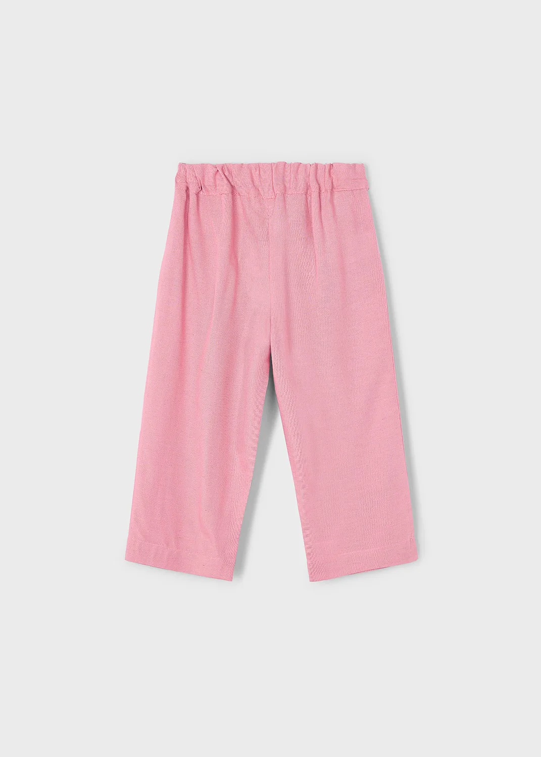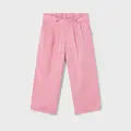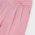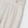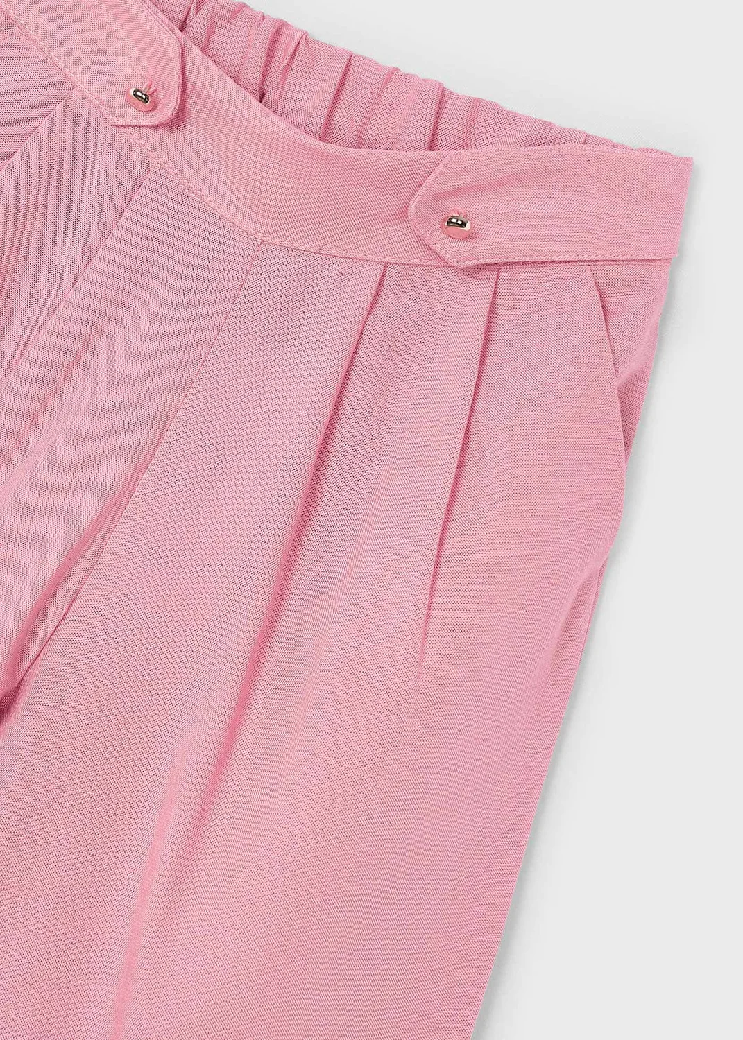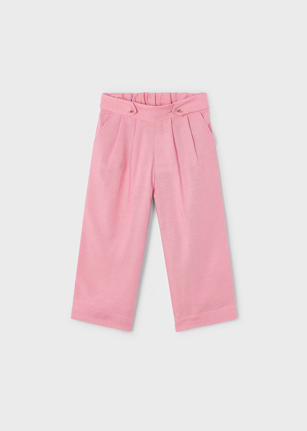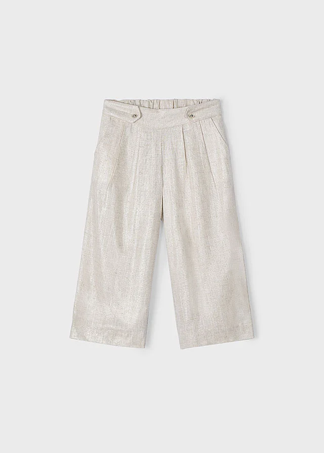 Pantalón largo de tipo culotte para niña, de línea amplia y holgada desde las caderas hasta el bajo. Ideal tanto para los looks más sofisticados como para los más informales. Goma elástica regulable con botones en el interior de la cinturilla para mayor ajuste. Tejido de aspecto fresco y actual con lino. Modelo con pinzas. Bolsillos funcionales en la parte delantera. Elementos de adorno: botones decorativos. Diseño liso.