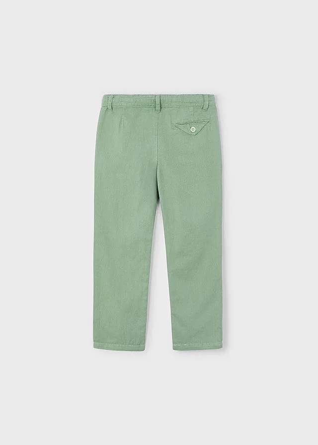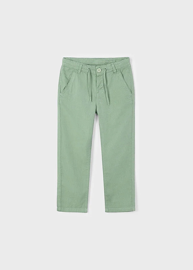 Pantalón largo para niño de tipo chino y corte holgado (relaxed). Cierre con cremallera y botón. Goma elástica regulable con botones en el interior de la cinturilla para mayor ajuste. Cinturilla con cordón ajustable. Tejido de aspecto fresco y actual con lino. Bolsillos en los laterales. Por motivos de seguridad, las tallas pequeñas (2-5 años) no llevarán cremallera en la bragueta, sino que será simulada. Al elegir nuestros productos de algodón estás apoyando nuestra inversión en la iniciativa Better Cotton. El algodón Better Cotton se obtiene mediante un sistema de balance de masas y no se puede rastrear físicamente hasta los productos finales. Sin embargo, los productores de algodón se benefician de la demanda de Better Cotton en volúmenes equivalentes.