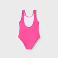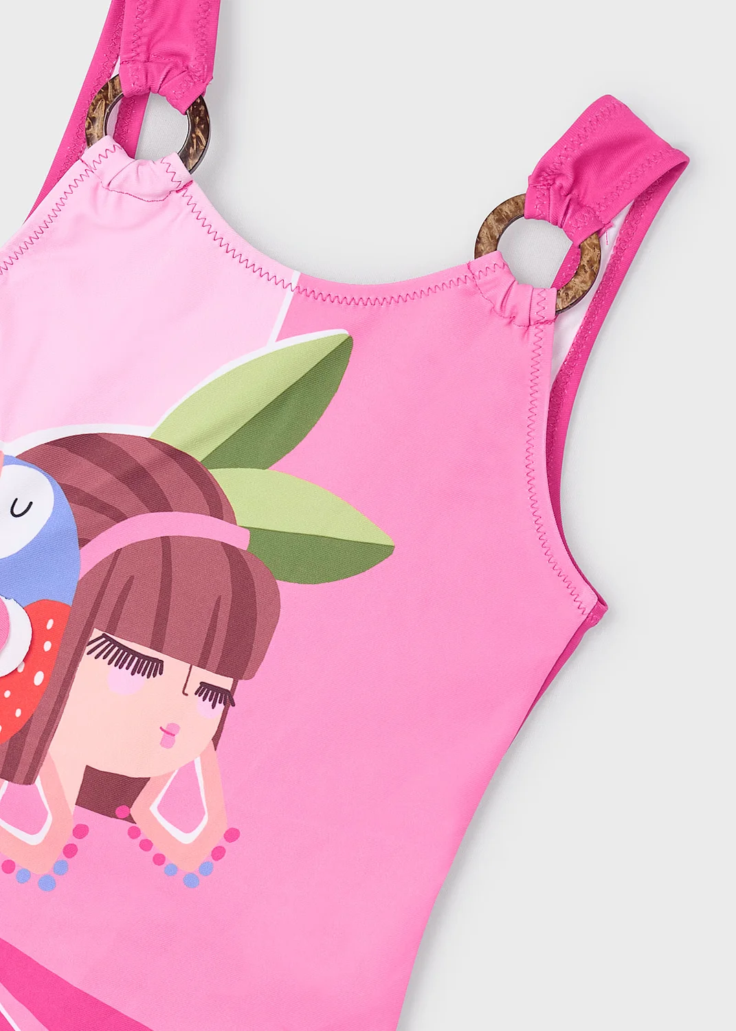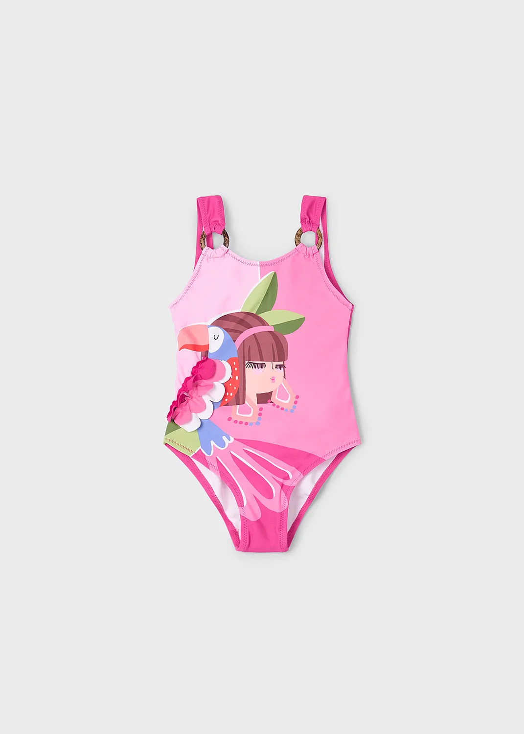 Bañador de tirantes para niña. Tejido elástico que aporta confort y libertad de movimientos. Elementos de adorno: serigrafía (print). Estampado tropical.