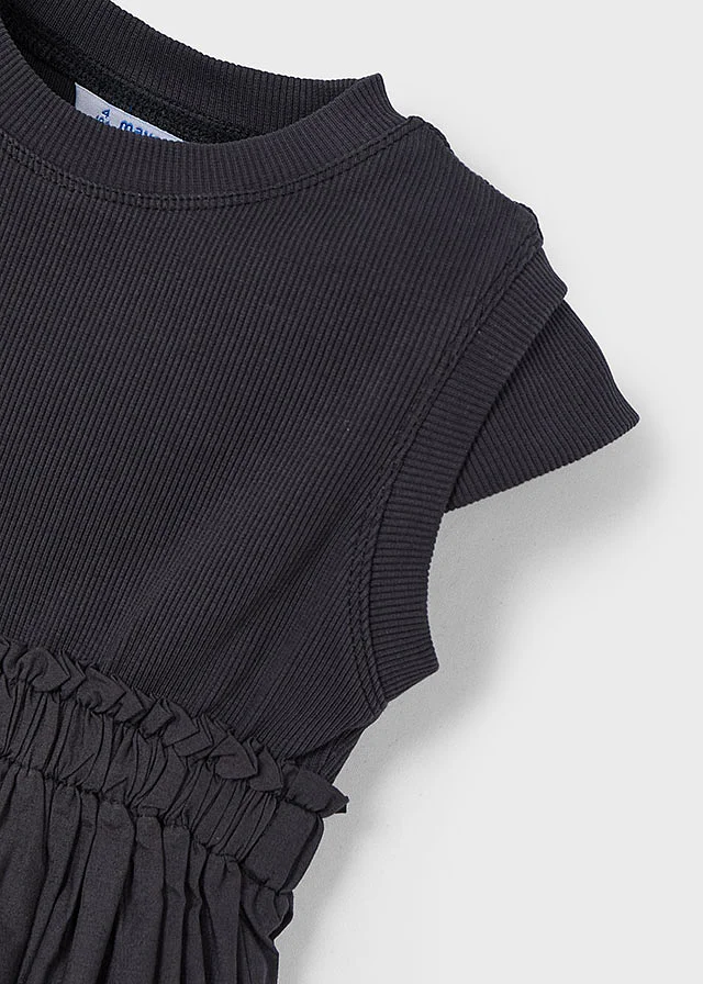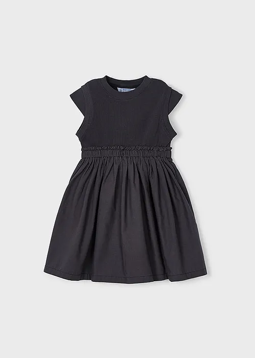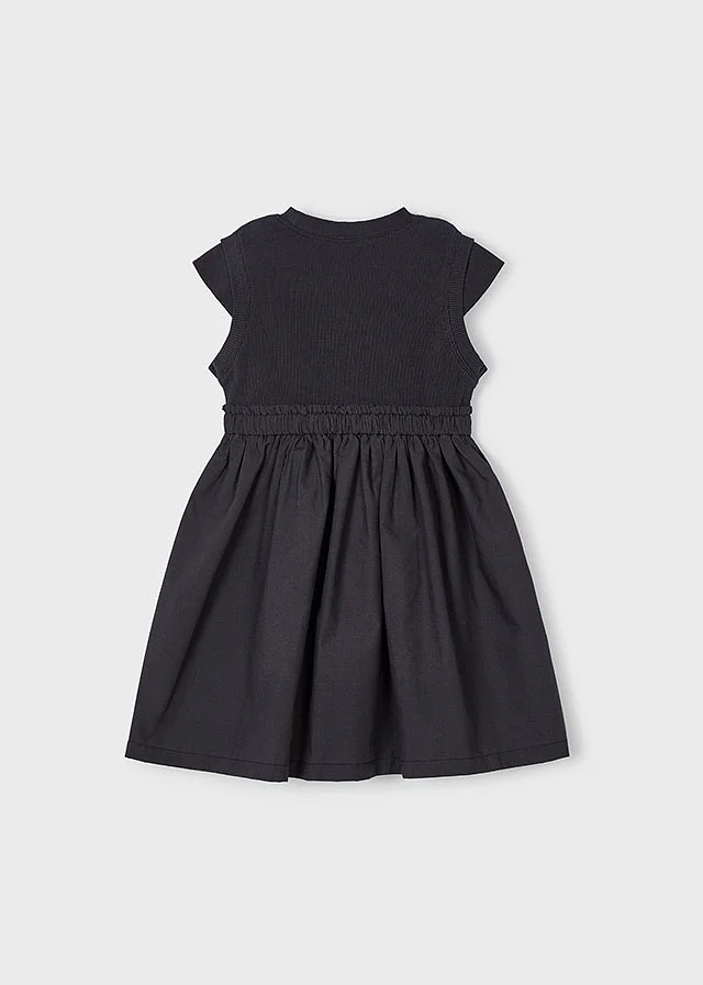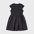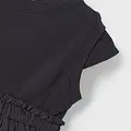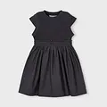 Vestido de manga corta para niña. Cuello redondo. Diseño con corte a la cintura. Cinturilla elástica. Modelo con rizo.