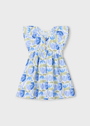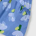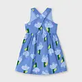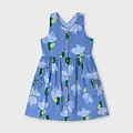 Vestido de tirantes para niña con espalda cruzada. Modelo con cuello de pico. Cierre con botones en la parte delantera. Tejido 100% algodón. Modelo con forro interior. Diseño con abertura en la espalda. Modelo con rizo. Bolsillos funcionales en la parte delantera y goma elástica. Elementos de adorno: apliques de lazos. Motivo de flores.