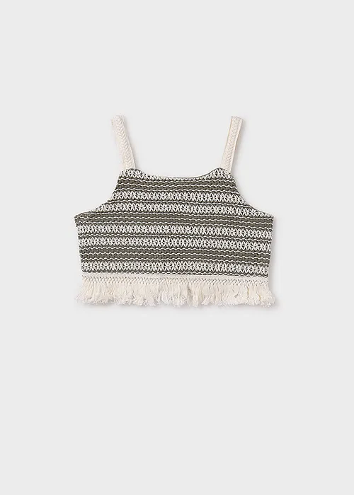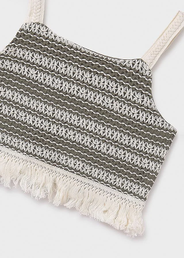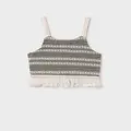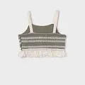 Top de tirantes para chica. Cierre lateral con botones a presión. Elementos de adorno: flecos, detalles de croché.