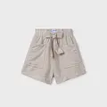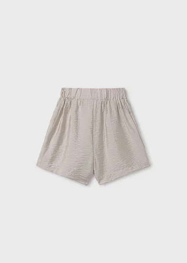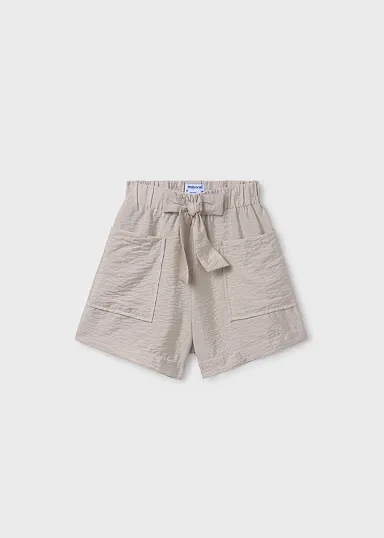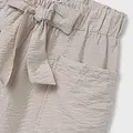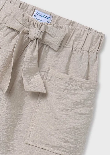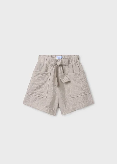 Pantalón corto para chica. Cinturilla elástica. Bolsillos funcionales en la parte delantera. Elementos de adorno: lazo, fajín simulado a la cintura.