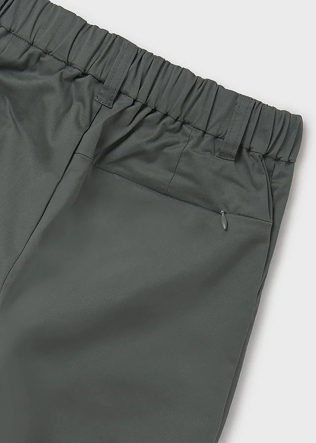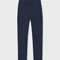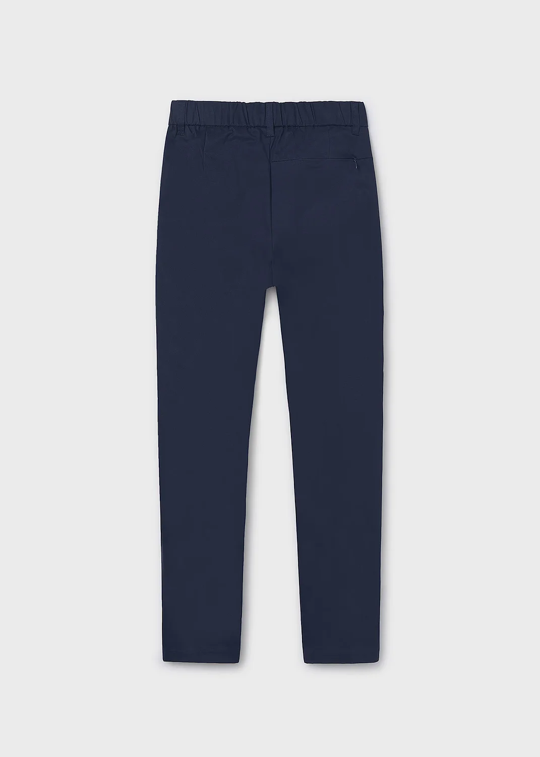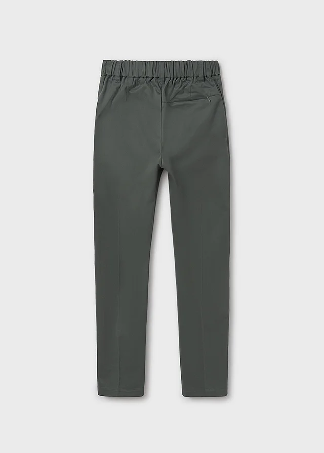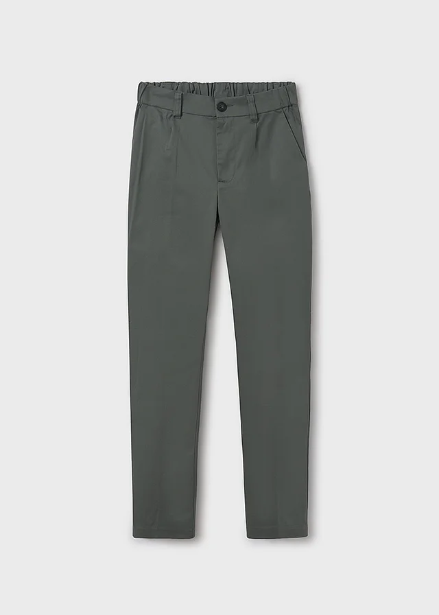 Pantalón largo para chico de tipo chino y corte ajustado (slim fit). Cierre con cremallera y botón. Goma elástica regulable con botones en el interior de la cinturilla para mayor ajuste. Suave tejido de algodón elástico. Modelo con pinzas. Bolsillos funcionales en la parte delantera. Bolsillo trasero funcional. Diseño liso.