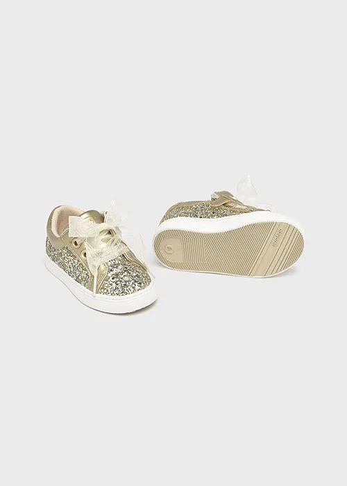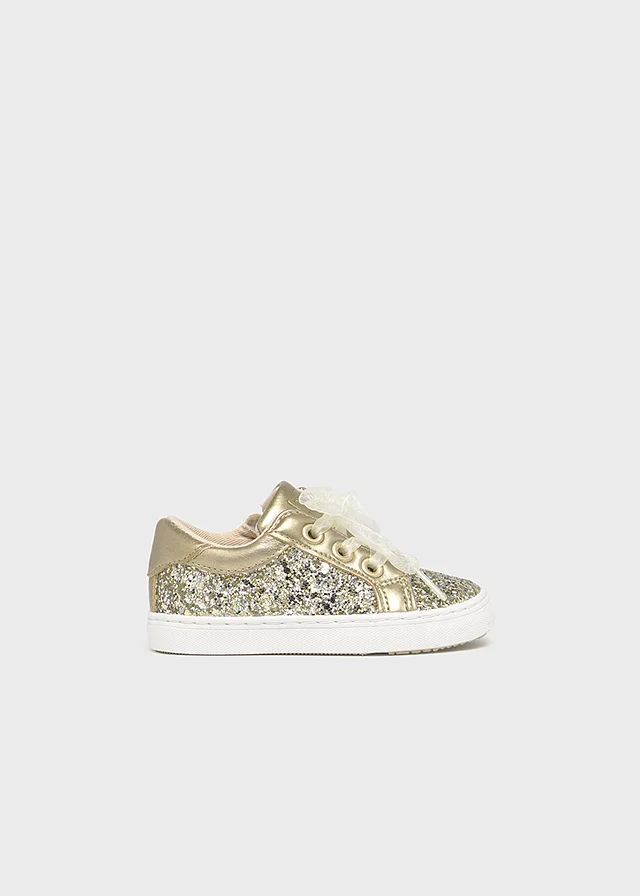 Zapatillas deportivas para bebé, de gran versatilidad para sus aventuras diarias. Material exterior efecto piel. Forro interior y plantilla de algodón transpirable. Suela de goma antideslizante para afianzar la pisada. Cierre con cremallera lateral para una puesta rápida y sencilla. Detalles en escarcha (glitter).