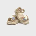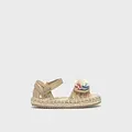 Sandalias de verano para bebé perfectas para los días de calor. Material exterior textil. Cómoda suela combinada de yute trenzado natural con goma antideslizante. Cierre regulable con doble velcro para una puesta rápida y un mejor ajuste. Aplique floral decorativo.