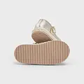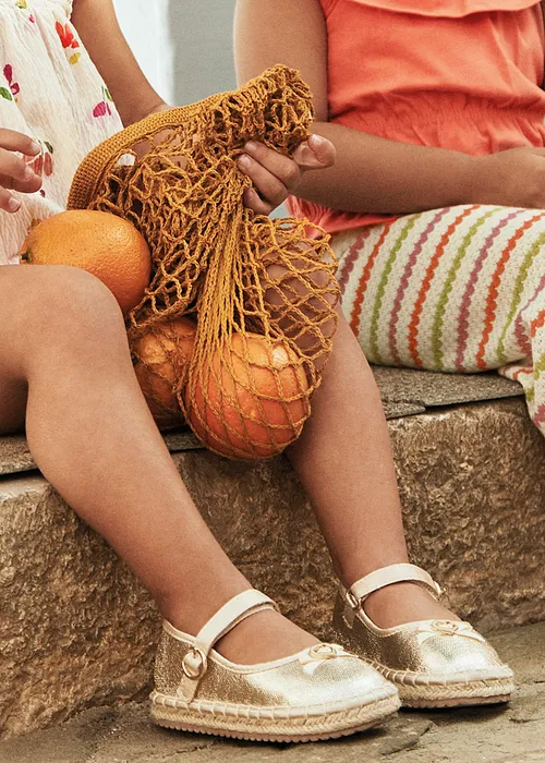 Bailarinas para bebé de estilo femenino y elegante. Con este zapato completarás sus estilismos más especiales. Forro interior y plantilla de algodón transpirable. Cómoda suela combinada de yute trenzado natural con goma antideslizante. Cierre con hebillas metálicas ajustables y velcro trasero para asegurar una adecuada sujeción del calzado. Lazo decorativo. Efecto metalizado.
