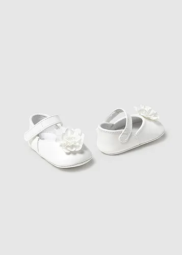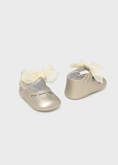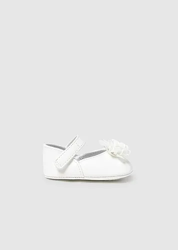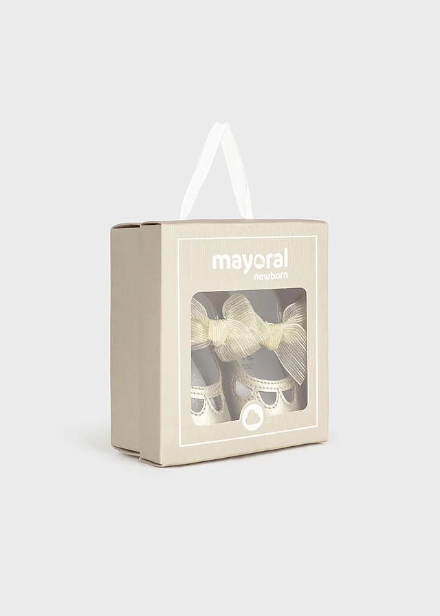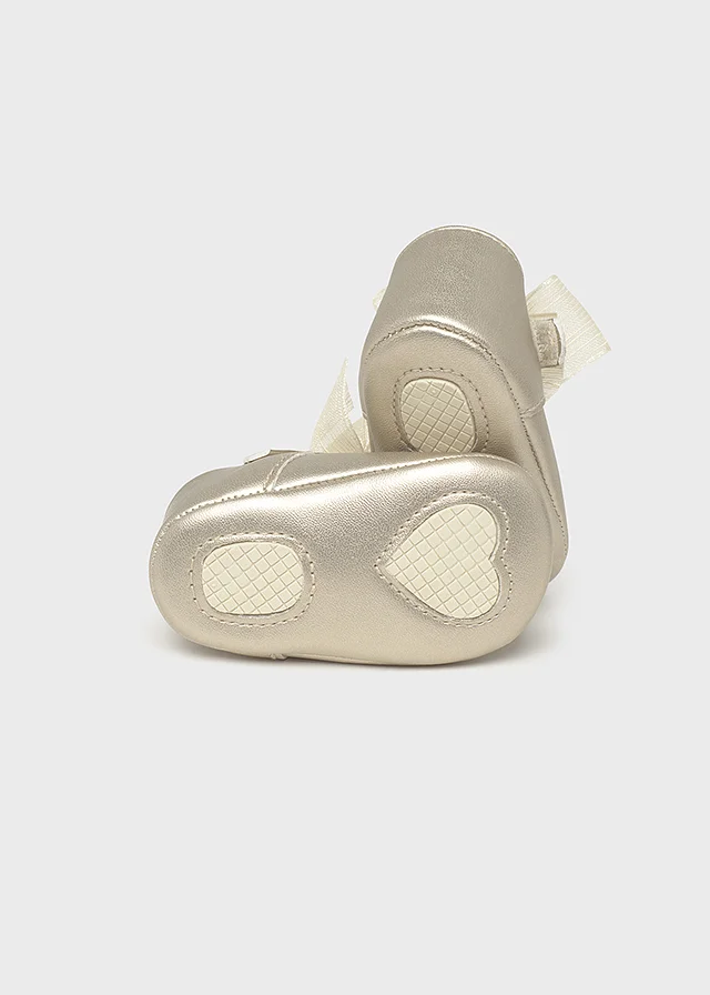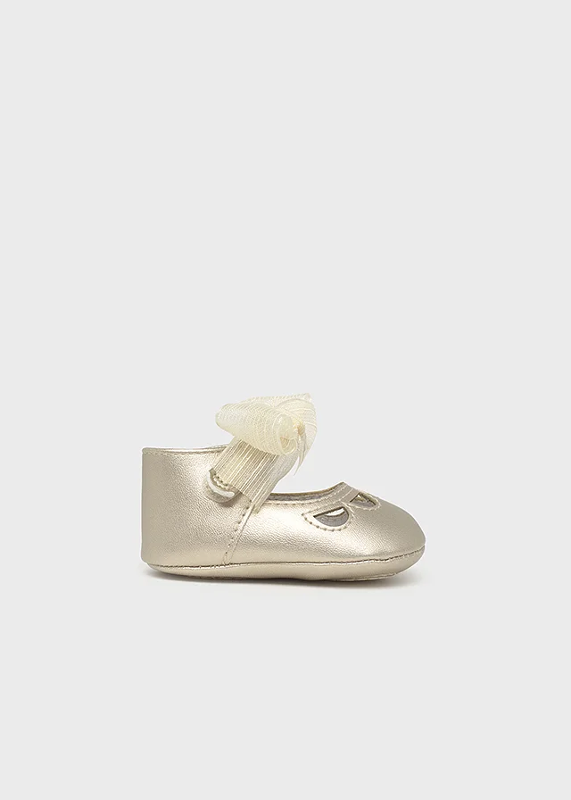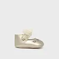 Zapatos de tipo merceditas para recién nacido, de estilo clásico y atemporal para sus estilismos más elegantes. Material exterior efecto piel. Forro interior y plantilla de algodón transpirable. Cierre con velcro ajustable que garantiza una perfecta sujeción del pie. Lazo decorativo.