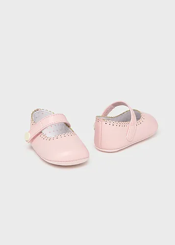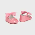 Zapatos de tipo merceditas para recién nacido, de estilo clásico y atemporal para sus estilismos más elegantes. Material exterior efecto piel. Forro interior y plantilla de algodón transpirable. Cierre con velcro ajustable que garantiza una perfecta sujeción del pie. Lazo decorativo.
