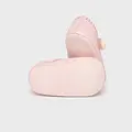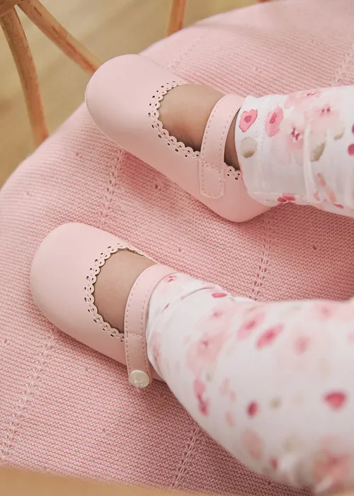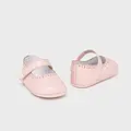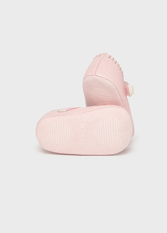 Zapatos de tipo merceditas para recién nacido, de estilo clásico y atemporal para sus estilismos más elegantes. Material exterior efecto piel. Forro interior y plantilla de algodón transpirable. Cierre con velcro ajustable que garantiza una perfecta sujeción del pie.